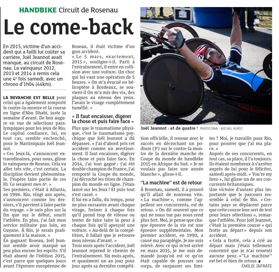 Joël JEANNOT a été victime d’un accident aujourd’hui lors d’un entraînement en handbike. Il aurait percuté une voiture selon le journal Sud Ouest. Blessé au visage il a été transporté à l'hôpital de Bordeaux pour être opéré d’une fracture du malaire, il aurait également plusieurs blessures au niveau du visage, toujours selon la même source. Handbike.fr et tout l’ASF Mulhouse souhaite un prompt rétablissement à Joël et qu’il guérisse vite. Une grosse pensée également pour son épouse Nadine avec qui il est rentré samedi de l'île de Lanzarote en Espagne.